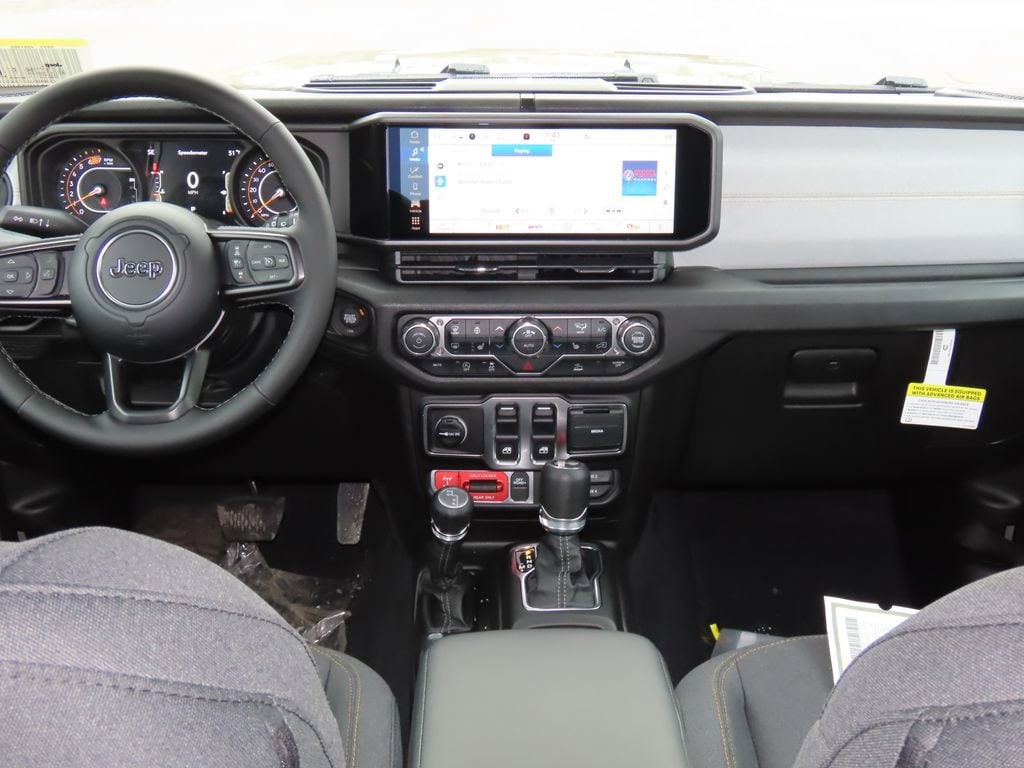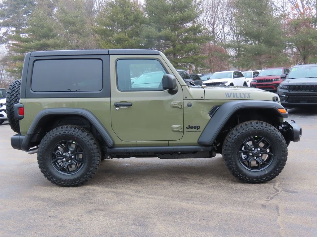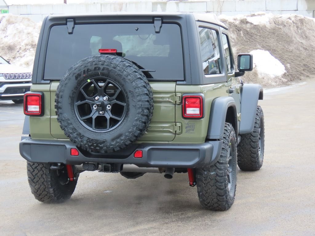 Convenience Group (2-Door Passive Entry, Front Door Locks, Air Conditioning with Auto Temp Control, Air Filtering, Cluster 7.0" TFT Color Display, Emergency/Assistance Call, Heated Front Seats, Heated Steering Wheel, and Universal Garage Door Opener), Quick Order Package 22W Willys (4-Wheel Drive Swing Gate Decal, 7 and 4 Pin Wiring Harness, Advanced Brake Assist, Automatic Headlamps, Auxiliary Switches, Black Grille with Gloss Black Rings, Class II Receiver Hitch, Conventional Differential Front Axle, Corning Gorilla Glass, Dana M210 Wide HD Tube Front Axle, Dana M220 Wide Rear Axle, Daytime Running Lamps LED Accents, Deep Tint Sunscreen Windows, E-Locker Rear Axle, Enhanced Adaptive Cruise Control, Front LED Fog Lamps, Full Speed Forward Collision Warning Plus, Increased Travel Export Tuned Suspension, Injection Molded Black Rear Bumper, LED Premium Reflector Headlamps, Mold in Color Bumper with Gloss Black, Molded in Color Rubicon Highline Flare, MOPAR All-Weather Floor Mats, Off-Road Plus Mode, Power Heated Mirrors, Premium Wrapped Steering Wheel, Security Alarm, Sun Visors with Illuminated Vanity Mirrors, Wheels: 17" x 7.5" Painted Black, and Willys Hood Decal), 12.3" Touchscreen Display, 4-Wheel Disc Brakes, 4G LTE Wi-Fi Hot Spot, 8 Speakers, ABS brakes, Air Conditioning, AM/FM radio: SiriusXM with 360L, Apple CarPlay, Apple CarPlay/Android Auto, Aux Battery, Black 3-Piece Hard Top, Brake assist, Cloth Low-Back Bucket Seats, Compass, Connectivity - US/Canada, Delay-off headlights, Driver door bin, Driver vanity mirror, Dual front impact airbags, Dual front side impact airbags, Electronic Stability Control, For More Info, Call 800-643-2112, Freedom Panel Storage Bag, Front anti-roll bar, Front Bucket Seats, Front Center Armrest w/Storage, Front fog lights, Front reading lights, Google Android Auto, Illuminated entry, Integrated Center Stack Radio, Integrated roll-over protection, Low tire pressure warning, Non-Lock Fuel Cap Without Discriminator, Normal Duty Suspension, Occupant sensing airbag, Outside temperature display, Overhead airbag, Panic alarm, ParkView Rear Back-Up Camera, Passenger door bin, Passenger vanity mirror, Power steering, Power windows, Radio data system, Radio: Uconnect 5 with 12.3" Display, Rear anti-roll bar, Rear reading lights, Rear Window Defroster, Rear Window Wiper/Washer, Remote keyless entry, SiriusXM Radio Service, SiriusXM with 360L, Speed control, Steering wheel mounted audio controls, Stop-Start Dual Battery System, Tachometer, Telescoping steering wheel, Tilt steering wheel, Traction control, Trip computer, Variably intermittent wipers, and Wheels: 17" x 7.5" Black Steel Styled
