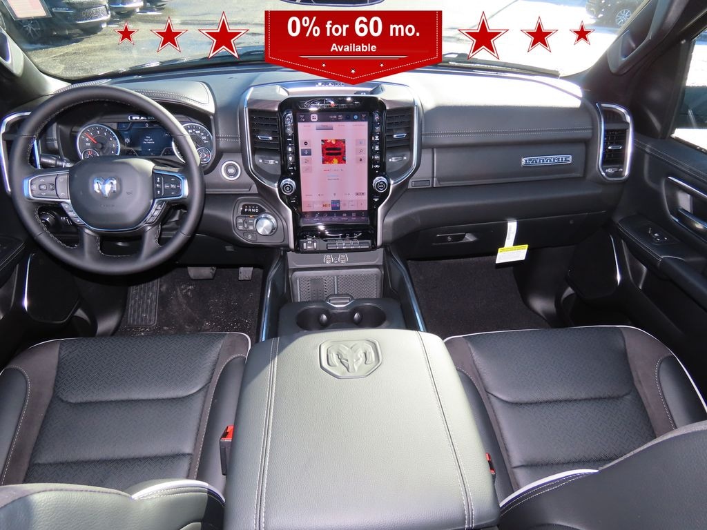 Laramie Level 1 Equipment Group (Rain Sensitive Windshield Wipers and Remote Tailgate Release), Laramie Preferred Package (Accent Color Premium Power Mirrors, Auto Power-Folding Mirrors, Auto-Dimming Exterior Driver Mirror, Black Painted Exterior Mirrors Caps, Body Color Front Bumper, Body Color Rear Bumper with Step Pads, Convex Wide-Angle Exterior Mirror Insert, Dome Dual LED Reading Lamp, Dual-Pane Panoramic Sunroof, Exterior Mirrors Courtesy Lamps, Exterior Mirrors with Heating Element, Exterior Mirrors with Memory, Exterior Mirrors with Supplemental Signals, Grille Surround 3 Body Color Tex 4 Chrome, LED Dome/Reading Lamp, Power Deployable Running Boards, RAM Grille Badge - Chrome, Tow Hooks, and Trailer Brake Control), Quick Order Package 27H Laramie, 10 Speakers, 4-Wheel Disc Brakes, 4G LTE Wi-Fi Hot Spot, ABS brakes, Active Noise Control System, Air Conditioning, Alloy wheels, AM/FM radio: SiriusXM with 360L, Anti-Spin Differential Rear Axle, Apple CarPlay/Android Auto, Audio memory, Auto High-beam Headlights, Auto-dimming door mirrors, Auto-dimming Rear-View mirror, Automatic temperature control, Brake assist, Bumpers: chrome, Chrome Exterior Mirrors, Compass, Connected Travel and Traffic Services, Connectivity - US/Canada, Delay-off headlights, Driver door bin, Driver vanity mirror, Dual front impact airbags, Dual front side impact airbags, Electronic Stability Control, Front anti-roll bar, Front Bucket Seats, Front Center Armrest w/Storage, Front dual zone A/C, Front fog lights, Front License Plate Bracket, Front reading lights, Front wheel independent suspension, Fully automatic headlights, Garage door transmitter, GPS Navigation, Heated door mirrors, Heated front seats, Heated rear seats, Heated steering wheel, Illuminated entry, Integrated Center Stack Radio, Integrated Voice Command with Bluetooth, Leather steering wheel, Leather Trimmed Bucket Seats, Low tire pressure warning, Memory seat, MOPAR Front and Rear Rubber Floor Mats, Navigation System, Occupant sensing airbag, Off-Road Information Pages, Outside temperature display, Overhead airbag, Overhead console, Panic alarm, ParkView Rear Back-Up Camera, Passenger door bin, Passenger vanity mirror, Power door mirrors, Power driver seat, Power passenger seat, Power steering, Power windows, Radio data system, Radio: Uconnect 5 Navigation with 12.0" Display, Rear anti-roll bar, Rear reading lights, Rear seat center armrest, Rear step bumper, Remote keyless entry, Security system, SiriusXM Radio Service, SiriusXM with 360L, Speed control, Split folding rear seat, Steering wheel mounted audio controls, Tachometer, Telescoping steering wheel, Tilt steering wheel, Traction control, Trip computer, Turn signal indicator mirrors, USB Host Flip, Variably intermittent wipers, Ventilated front seats, Voltmeter, and Wheels: 20" x 9" Premium Paint/Polish
