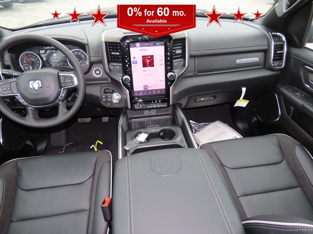 Laramie Level 1 Equipment Group (Rain Sensitive Windshield Wipers and Remote Tailgate Release), Laramie Preferred Package (Accent Color Premium Power Mirrors, Auto Power-Folding Mirrors, Auto-Dimming Exterior Driver Mirror, Black Painted Exterior Mirrors Caps, Body Color Front Bumper, Body Color Rear Bumper with Step Pads, Convex Wide-Angle Exterior Mirror Insert, Dome Dual LED Reading Lamp, Dual-Pane Panoramic Sunroof, Exterior Mirrors Courtesy Lamps, Exterior Mirrors with Heating Element, Exterior Mirrors with Memory, Exterior Mirrors with Supplemental Signals, Grille Surround 3 Body Color Tex 4 Chrome, LED Dome/Reading Lamp, Power Deployable Running Boards, RAM Grille Badge - Chrome, Tow Hooks, and Trailer Brake Control), Quick Order Package 27H Laramie, 10 Speakers, 4-Wheel Disc Brakes, 4G LTE Wi-Fi Hot Spot, ABS brakes, Active Noise Control System, Adjustable pedals, Air Conditioning, Alloy wheels, AM/FM radio: SiriusXM with 360L, Anti-Spin Differential Rear Axle, Apple CarPlay/Android Auto, Audio memory, Auto High-beam Headlights, Auto-dimming door mirrors, Auto-dimming Rear-View mirror, Automatic temperature control, Brake assist, Bumpers: chrome, Chrome Exterior Mirrors, Compass, Connected Travel and Traffic Services, Connectivity - US/Canada, Delay-off headlights, Driver door bin, Driver vanity mirror, Dual front impact airbags, Dual front side impact airbags, Electronic Stability Control, Front anti-roll bar, Front Bucket Seats, Front Center Armrest w/Storage, Front dual zone A/C, Front fog lights, Front License Plate Bracket, Front reading lights, Front wheel independent suspension, Fully automatic headlights, Garage door transmitter, GPS Navigation, Heated door mirrors, Heated front seats, Heated rear seats, Heated steering wheel, Illuminated entry, Integrated Center Stack Radio, Integrated Voice Command with Bluetooth, Leather steering wheel, Leather Trimmed Bucket Seats, Low tire pressure warning, Memory seat, MOPAR Front and Rear Rubber Floor Mats, Navigation System, Occupant sensing airbag, Off-Road Information Pages, Outside temperature display, Overhead airbag, Overhead console, Panic alarm, ParkView Rear Back-Up Camera, Passenger door bin, Passenger vanity mirror, Pedal memory, Power door mirrors, Power driver seat, Power passenger seat, Power steering, Power windows, Radio data system, Radio: Uconnect 5 Navigation with 12.0" Display, Rear anti-roll bar, Rear reading lights, Rear seat center armrest, Rear step bumper, Remote keyless entry, Security system, SiriusXM Radio Service, SiriusXM with 360L, Speed control, Split folding rear seat, Steering wheel mounted audio controls, Tachometer, Telescoping steering wheel, Tilt steering wheel, Traction control, Trip computer, Turn signal indicator mirrors, USB Host Flip, Variably intermittent wipers, Ventilated front seats, Voltmeter, and Wheels: 20" x 9" Premium Paint/Polish